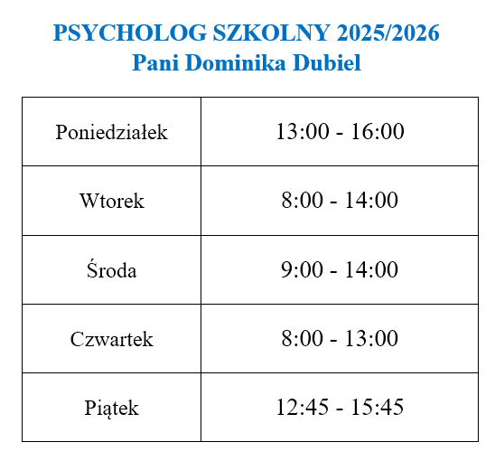 Pani psycholog ma dyżur w szkole w drugi piątek miesiąca w godz. 9.30-11.30,