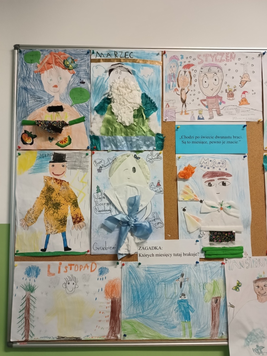 Potem trzecioklasiści uruchomili swoją wyobraźnię i wykorzystując technikę kolażu stworzyli portrety wybranych przez siebie miesięcy. Powstały bardzo ciekawe prace.