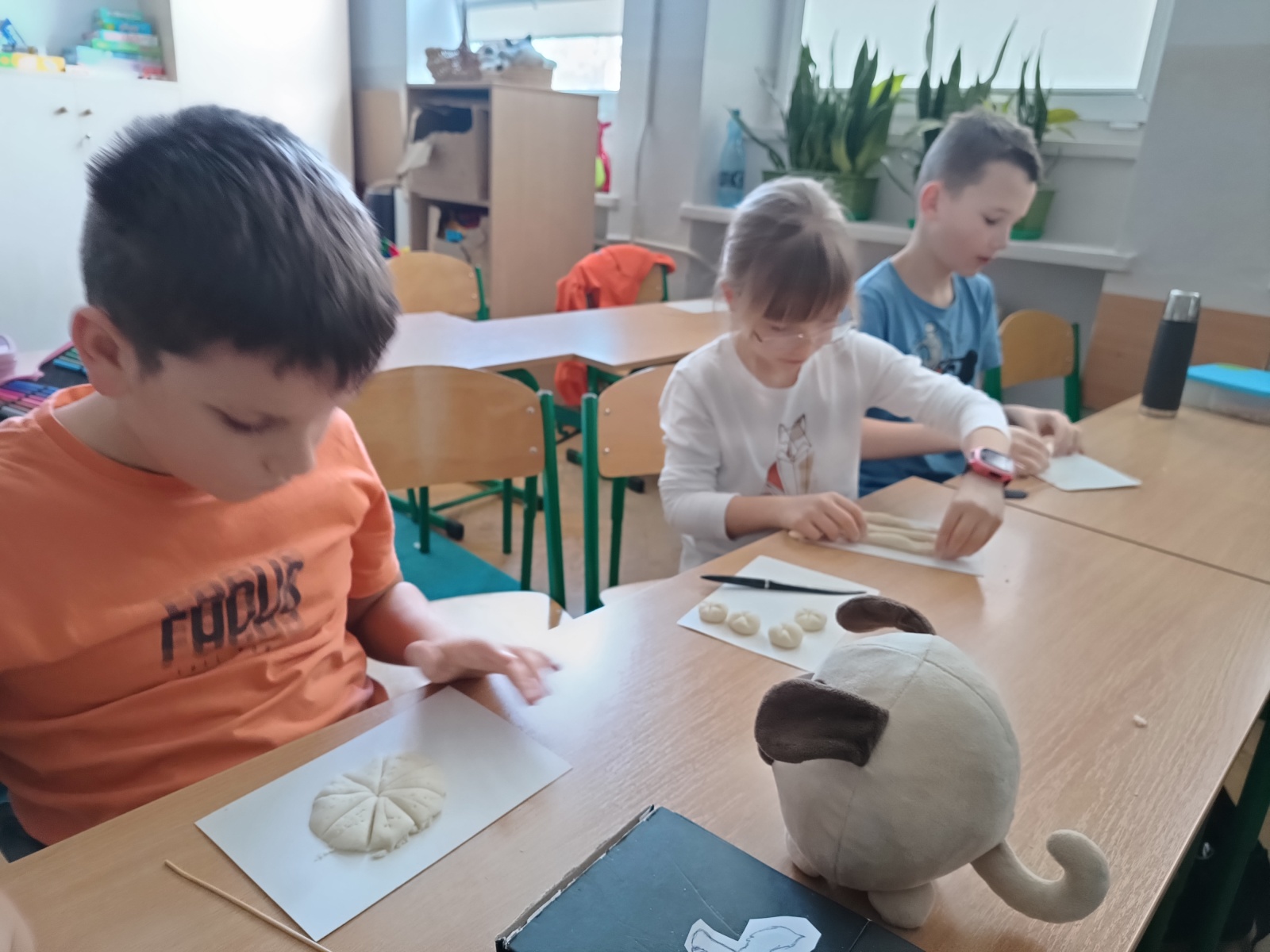 Na zakończenie całego cyklu zajęć trzecioklasiści sami spróbowali swoich sił w „pieczeniu chleba”. Z masy solnej lepili różne rodzaje pieczywa. Powstały  bułeczki, rogaliki, obwarzanki, precelki a nawet pizza.