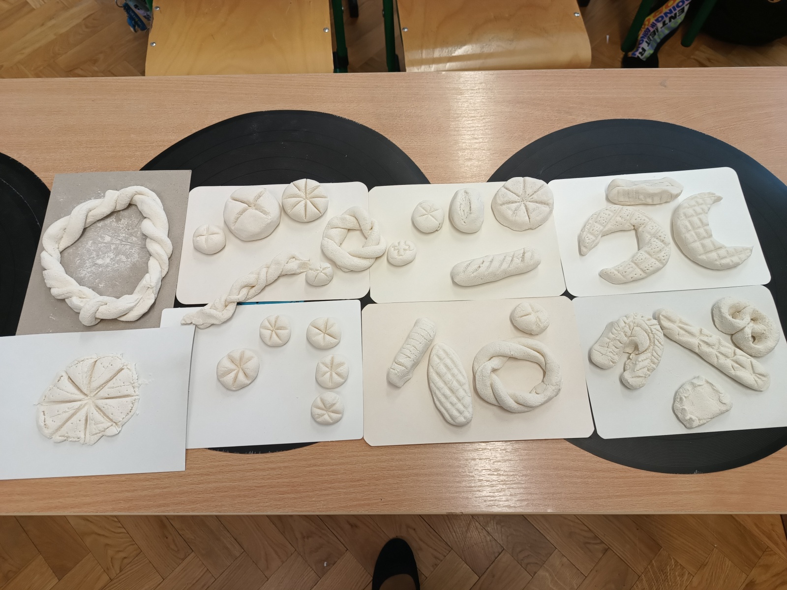 Na zakończenie całego cyklu zajęć trzecioklasiści sami spróbowali swoich sił w „pieczeniu chleba”. Z masy solnej lepili różne rodzaje pieczywa. Powstały  bułeczki, rogaliki, obwarzanki, precelki a nawet pizza.