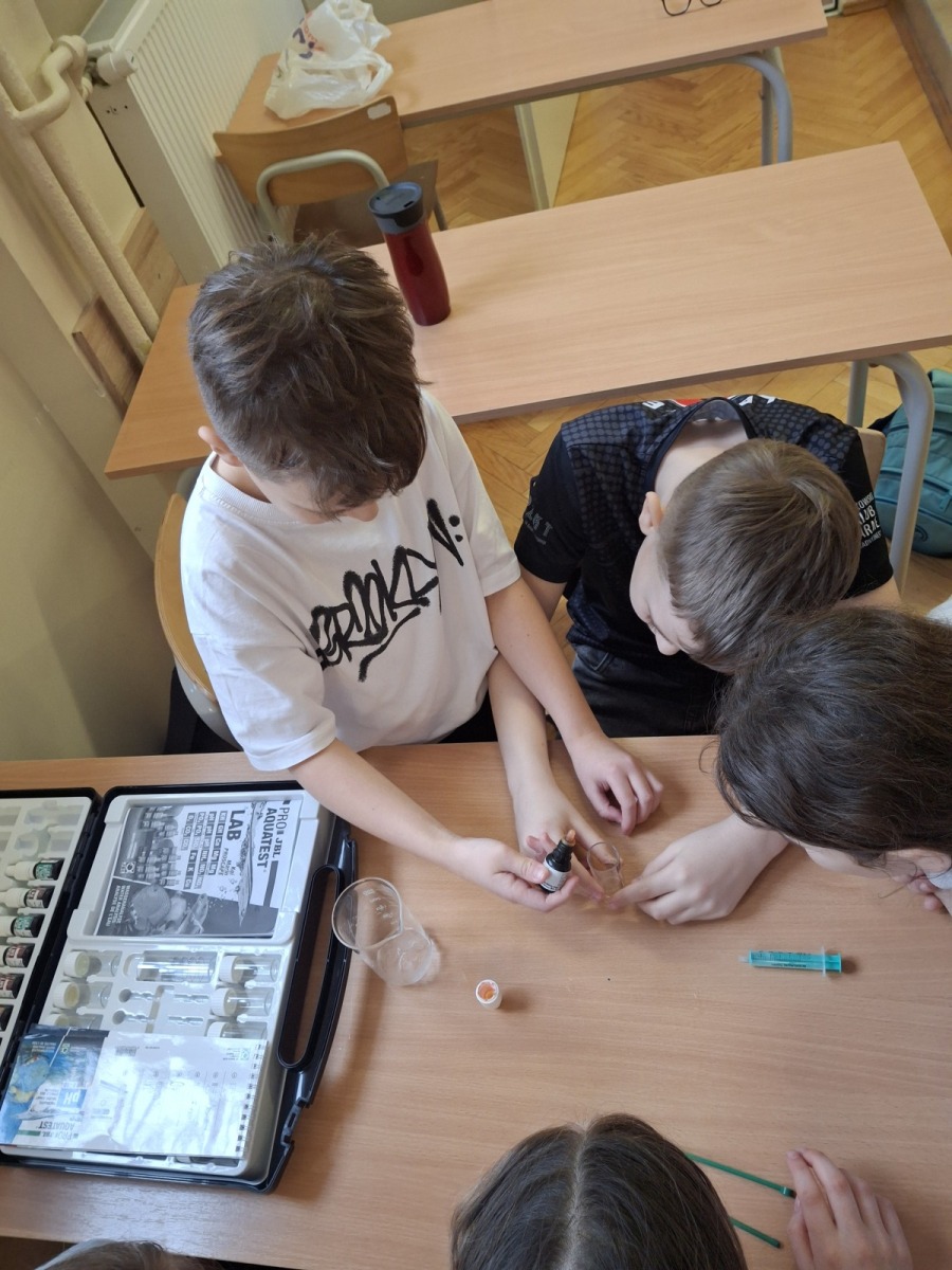 Podczas zajęć terenowych uczniowie pobrali próbki śniegu z wybranych miejsc w okolicy szkoły. Następnie, w sali chemicznej, przeprowadzili analizę przy użyciu zestawu do badań wody TestLab. Czwartoklasiści samodzielnie wykonywali pomiary, porównywali barwy wskaźników oraz zapisywali wyniki w kartach obserwacji. Badania wykazały, że śnieg miał pH równe 4-4,5, co oznacza odczyn kwaśny.