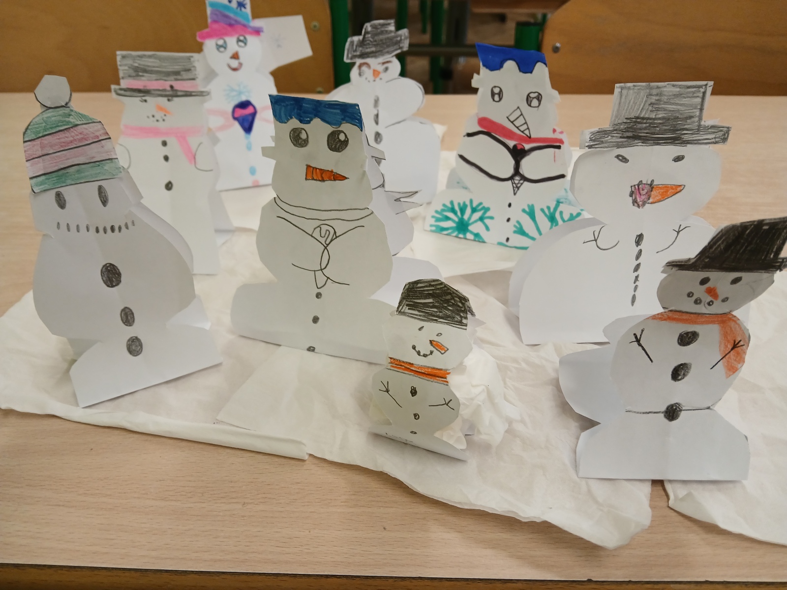 Choć za oknami jeszcze kalendarzowa jesień, a pogoda przypomina chwilami wręcz wiosnę, w naszej świetlicy – już zima. W grudniu dzieci z klas pierwszych podczas zajęć świetlicowych wykonały szereg prac plastyczno – technicznych związanych tematycznie z zimą. Nie zabrakło oczywiście bałwanków; Mikołaja, który wpadł do komina; bombek; chatek z piernika i zimowego krajobrazu wykonanego kredą na czarnych tabliczkach.