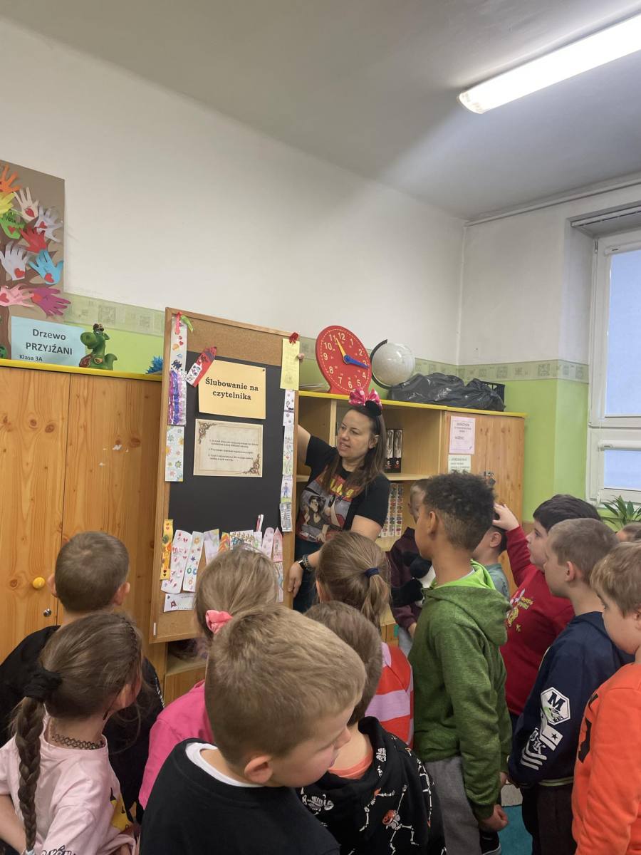 W listopadzie w bibliotece szkolnej przeprowadzono lekcje dla uczniów klas pierwszych. Pierwszoklasiści zapoznani zostali z Regulaminem Biblioteki, Regulaminem Czytelni oraz zwiedzili pomieszczenia należące do biblioteki. Następnie pani bibliotekarka wykorzystując teatrzyk „Wypożyczalnia skrzydeł”, zaprezentowała uczniom  księgozbiór szkolny. Na zakończenie lekcji, uczniowie złożyli uroczyste Ślubowanie Czytelnika i wypożyczyli pierwsze książki.  Największym powodzeniem cieszyły się pozycje o piłkarzach oraz o zwierzętach.