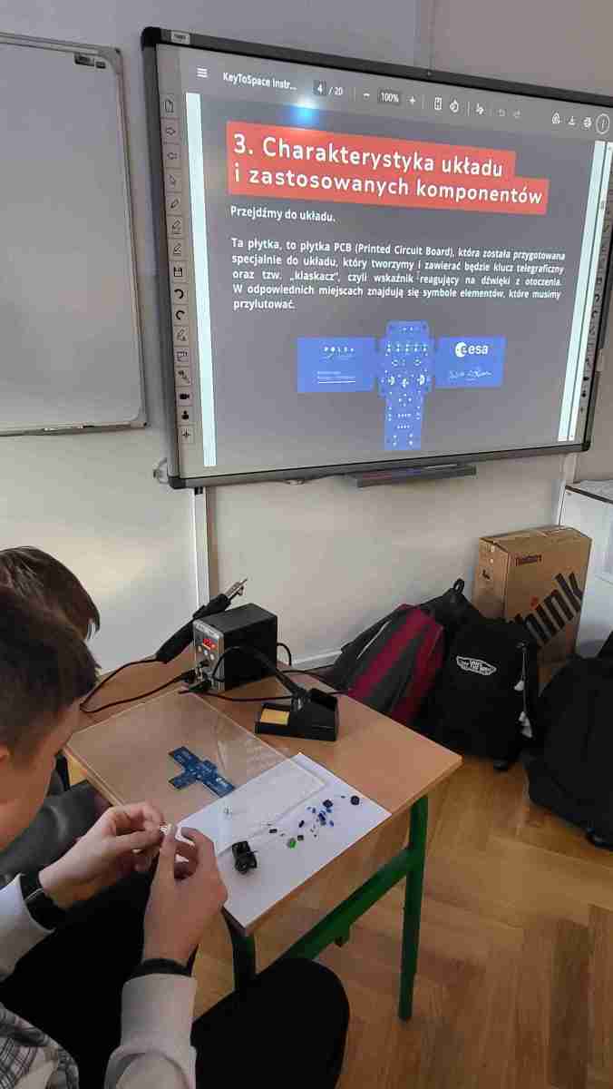 W I półroczu roku szkolnego 2025/2026 w szkole odbyły się inspirujące zajęcia w ramach ogólnopolskiego programu edukacyjnego Ignis – „Klucz do Kosmosu”, realizowanego przez Polską Agencję Kosmiczną (POLSA) w związku z misją kosmiczną IGNIS. Celem projektu jest rozwijanie kompetencji inżynieryjnych, kreatywności oraz zainteresowania naukami ścisłymi wśród młodzieży. Podczas zajęć uczniowie mieli okazję samodzielnie zbudować klucz telegraficzny – urządzenie elektroniczne składające się z obwodu klucza oraz sygnalizatora dźwięku i światła – które pozwala nadawać komunikaty alfabetem Morse’a. To praktyczne ćwiczenie wymagało od młodych konstruktorów poznania podstaw elektroniki i lutowania, a także alfabetu Morse’a, co dodatkowo rozwijało ich umiejętności techniczne i logiczne.