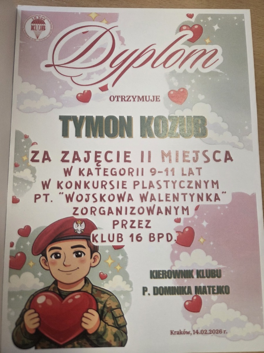 Z radością informujemy, że Tymon Kozub, uczeń klasy 3c, zdobył II miejsce w konkursie plastycznym „Wojskowa Walentynka” zorganizowanym przez Klub 16 BPD. Praca Tymona została doceniona za pomysłowość, staranność wykonania oraz kreatywne ujęcie tematu. To już kolejny sukces Tymona — już wcześniej zdobywał nagrody w konkursach plastycznych, rozwijając swoją pasję.