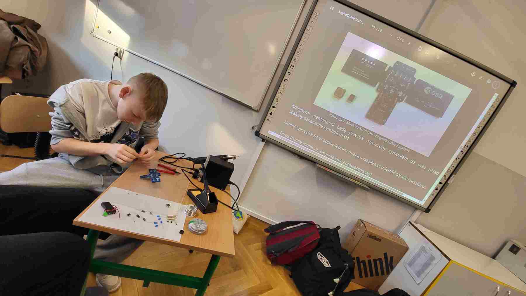 W I półroczu roku szkolnego 2025/2026 w szkole odbyły się inspirujące zajęcia w ramach ogólnopolskiego programu edukacyjnego Ignis – „Klucz do Kosmosu”, realizowanego przez Polską Agencję Kosmiczną (POLSA) w związku z misją kosmiczną IGNIS. Celem projektu jest rozwijanie kompetencji inżynieryjnych, kreatywności oraz zainteresowania naukami ścisłymi wśród młodzieży. Podczas zajęć uczniowie mieli okazję samodzielnie zbudować klucz telegraficzny – urządzenie elektroniczne składające się z obwodu klucza oraz sygnalizatora dźwięku i światła – które pozwala nadawać komunikaty alfabetem Morse’a. To praktyczne ćwiczenie wymagało od młodych konstruktorów poznania podstaw elektroniki i lutowania, a także alfabetu Morse’a, co dodatkowo rozwijało ich umiejętności techniczne i logiczne.