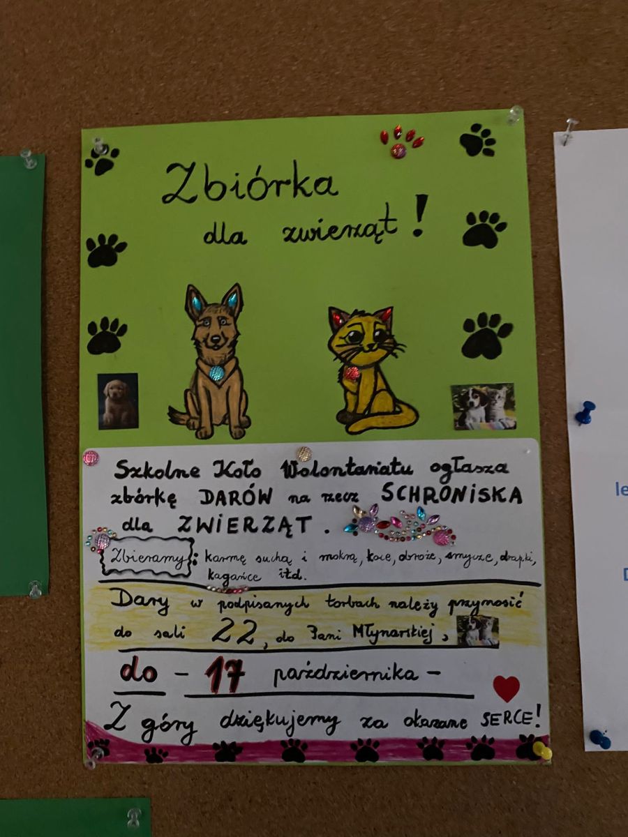 Zbieramy między innymi: karmę dla psów i kotów (suchą i mokrą), zabawki dla zwierząt, koce, kołdry bez pierza, smycze itp. Zbiórka będzie trwała do 17 października 2025 r. Rzeczy w podpisanych torebkach prosimy przynosić do sali nr 22.