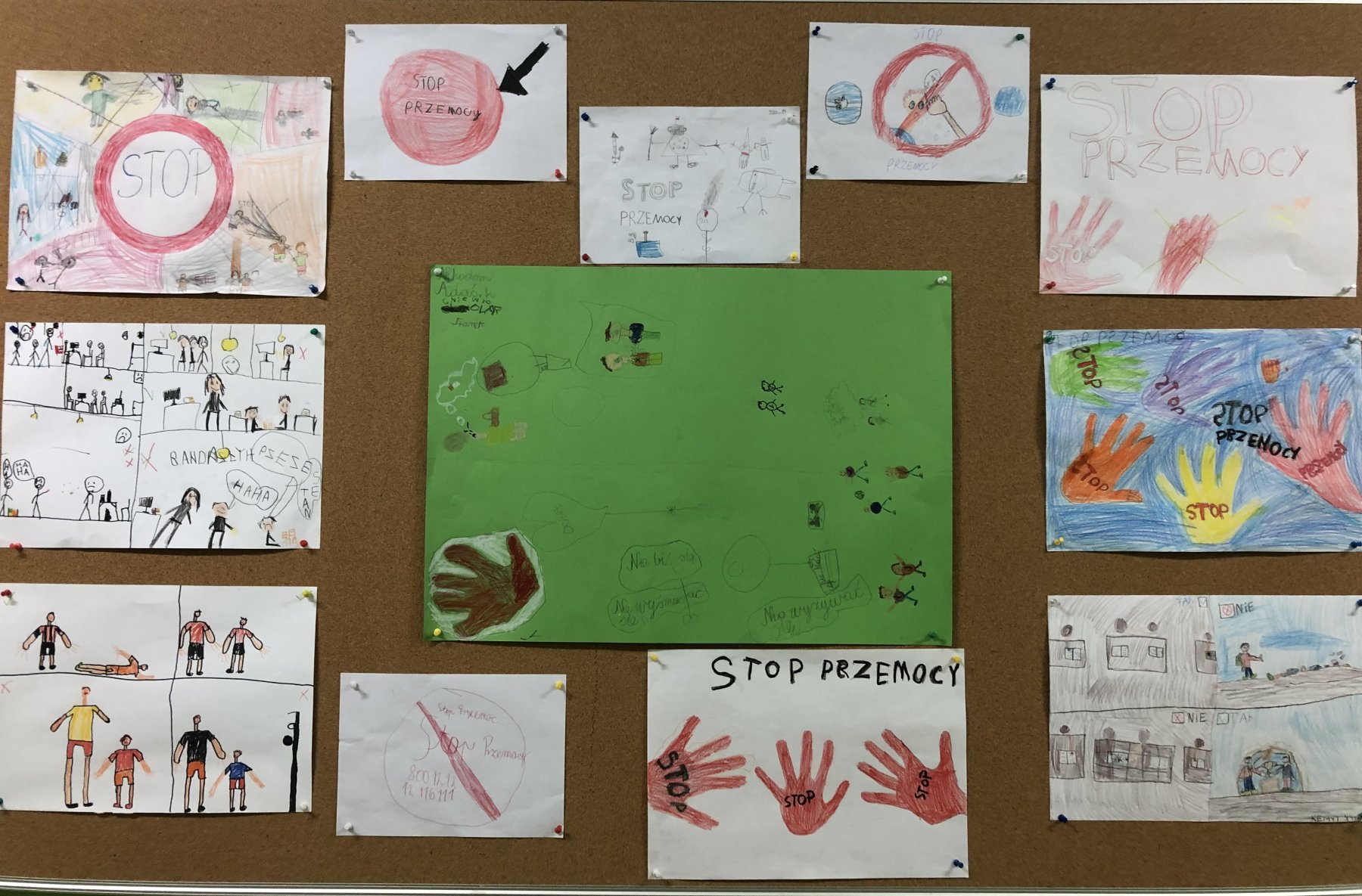 Podsumowaniem działań było wykonanie przez uczniów tematycznych plakatów, które przedstawiały hasła i symbole sprzeciwu wobec przemocy. Prace zostały umieszczone na korytarzu szkolnym, przypominając wszystkim, jak ważne jest dbanie o bezpieczeństwo i dobre relacje wśród rówieśników.