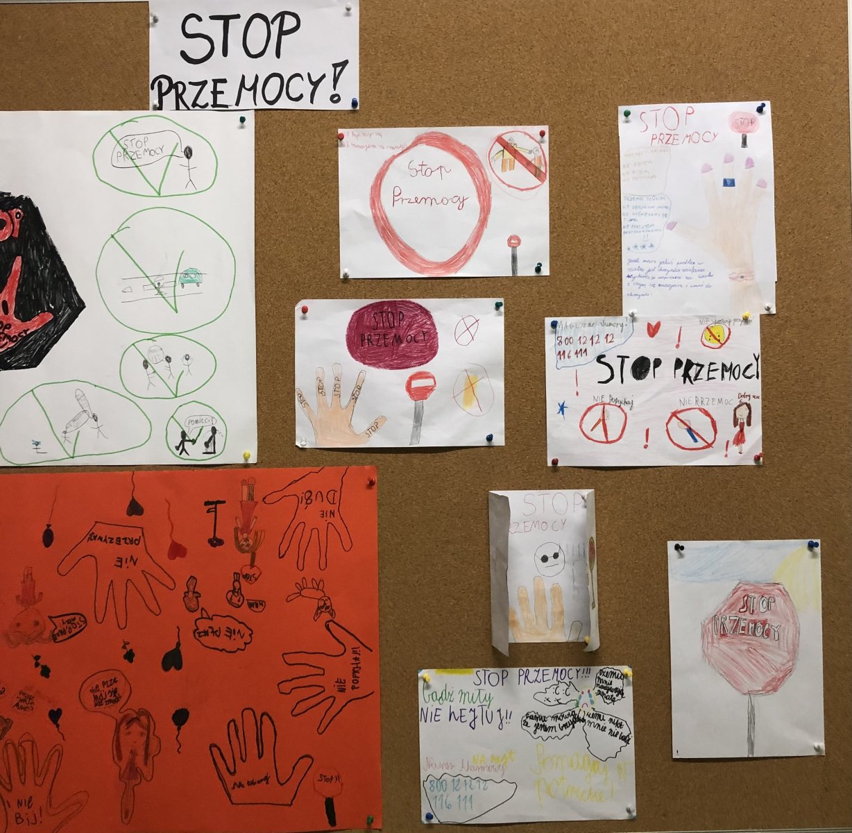 Podsumowaniem działań było wykonanie przez uczniów tematycznych plakatów, które przedstawiały hasła i symbole sprzeciwu wobec przemocy. Prace zostały umieszczone na korytarzu szkolnym, przypominając wszystkim, jak ważne jest dbanie o bezpieczeństwo i dobre relacje wśród rówieśników.