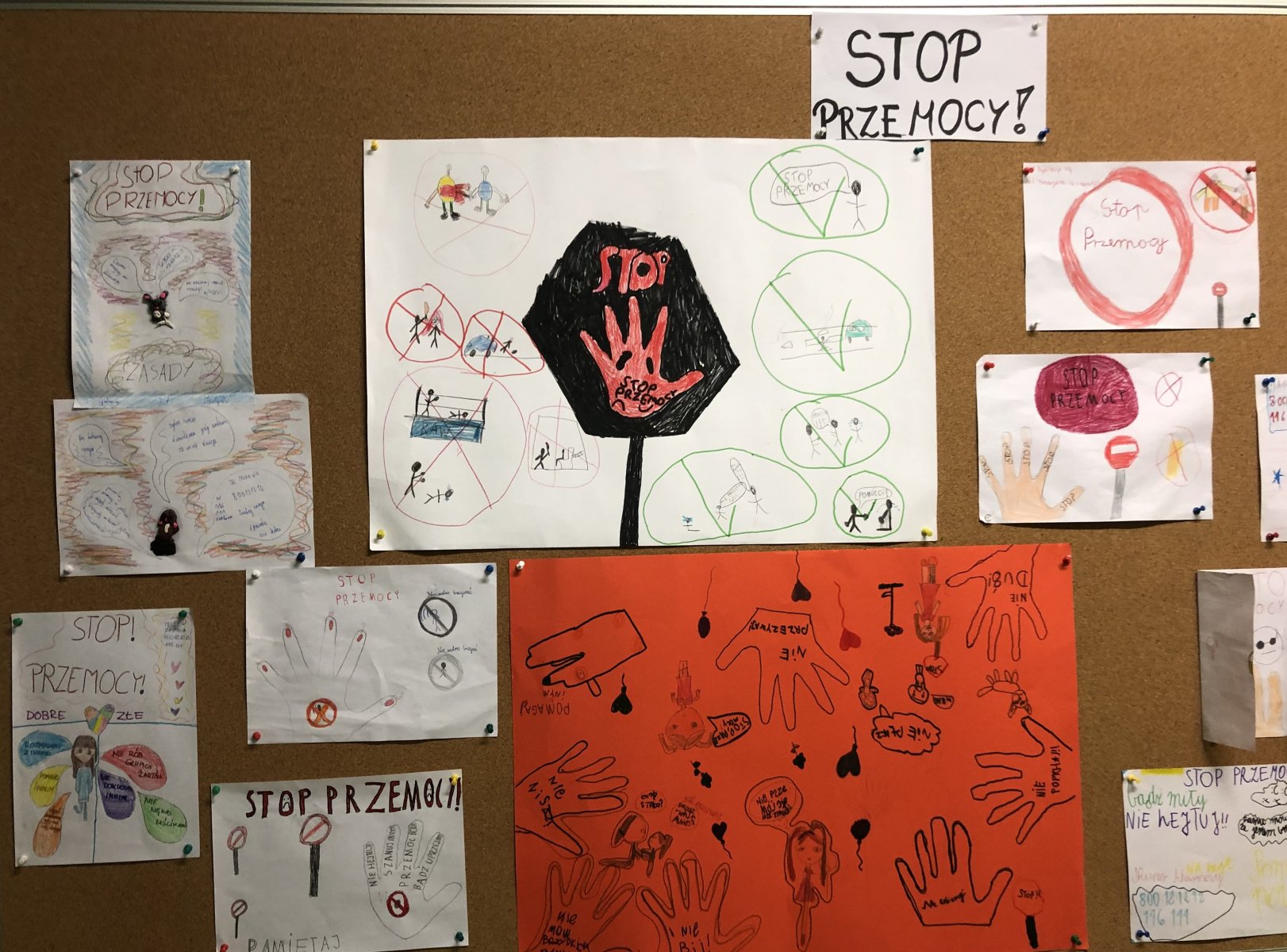 Podsumowaniem działań było wykonanie przez uczniów tematycznych plakatów, które przedstawiały hasła i symbole sprzeciwu wobec przemocy. Prace zostały umieszczone na korytarzu szkolnym, przypominając wszystkim, jak ważne jest dbanie o bezpieczeństwo i dobre relacje wśród rówieśników.